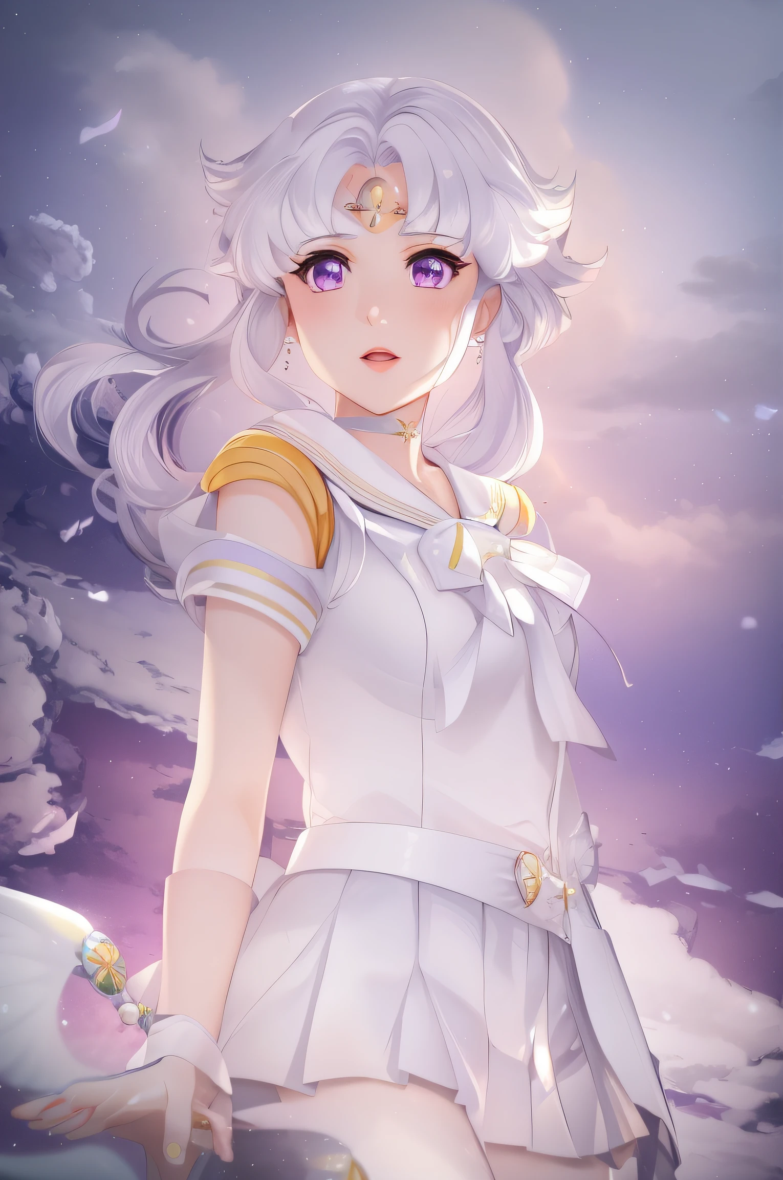 photorealistic, (hyperrealistic:1.2) , (extremely detailed CG unity 8k wallpaper) , (ultra-detailed) , masterpiece, best quality, 1girl, sailor cosmos, standing, fullbody, solo, long hair, skirt, hair ornament, twintails, jewelry, purple eyes, white hair, pleated skirt, earrings, choker, sailor collar, hair bun, cape, character name, double bun, facial mark, white skirt, brooch, white sailor collar, hairpin, forehead mark, white choker, sailor senshi uniform, holding staff