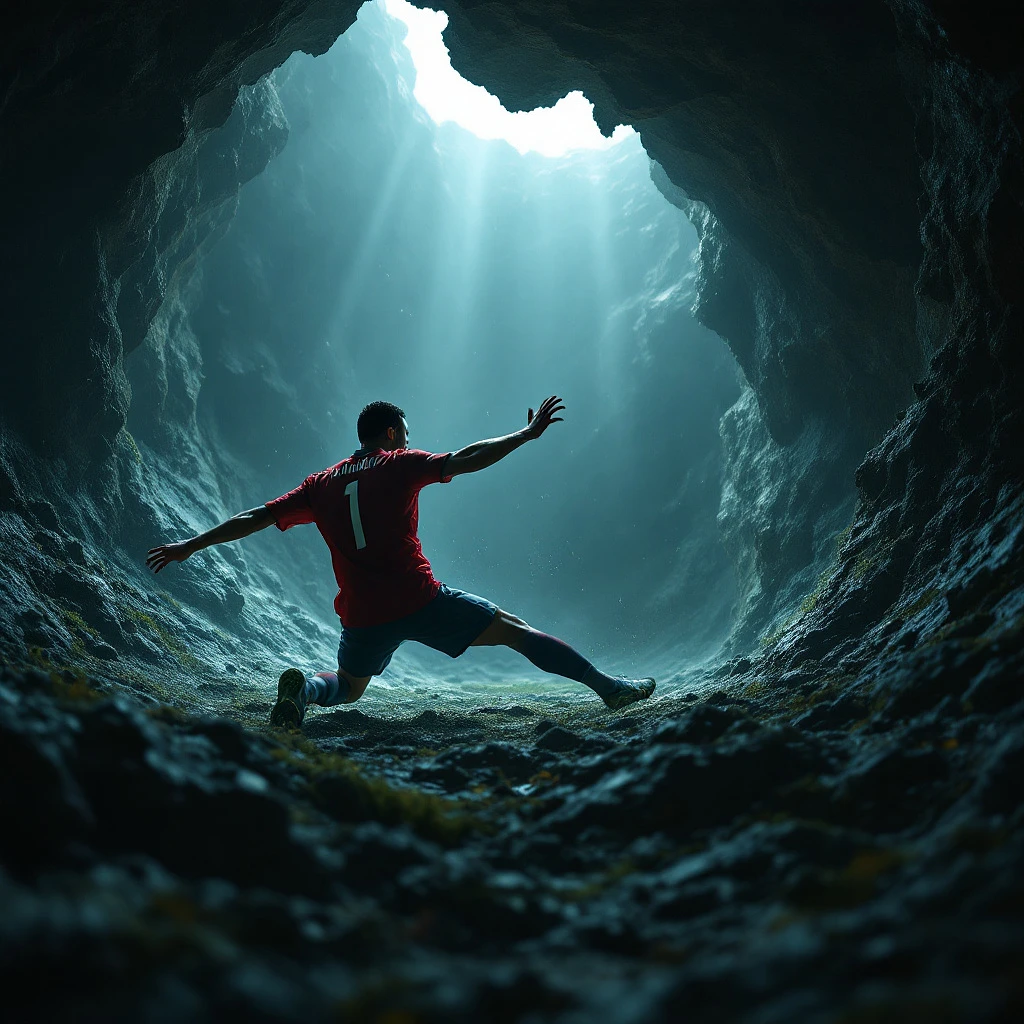 Ronaldo scoring an unbelievable goal in a cave incredibly lost and screaming, 8k, HD, nanites, volumetric lighting, low quality