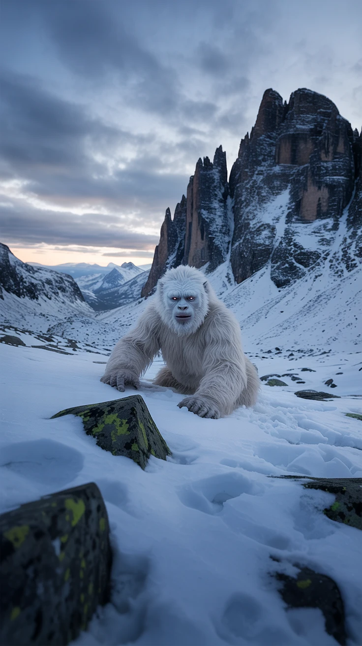 A low quality photo. The photo was taken quickly, leaving the image blurry and unstable due to the movement of the camera. The scene shows a Yeti hiding in a snowy mountain