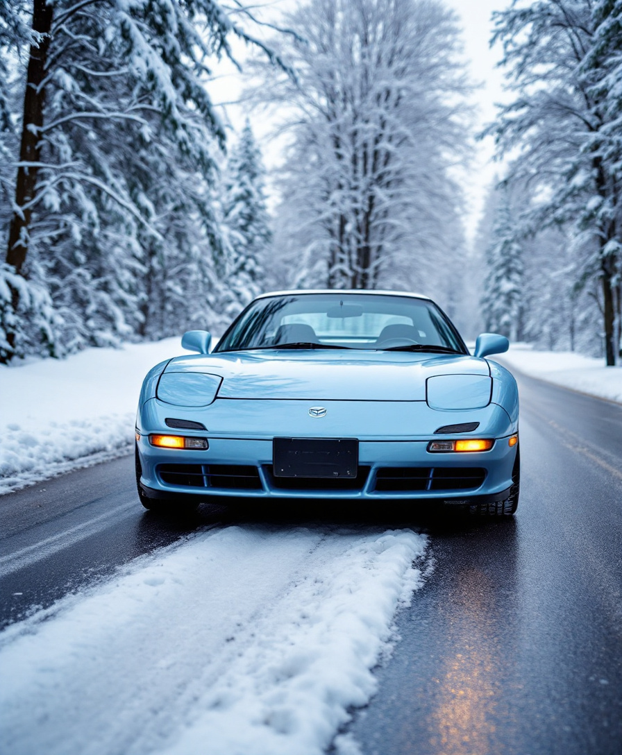 FLUX prompt: year 1988 mazda rx7 in light blue color in winter