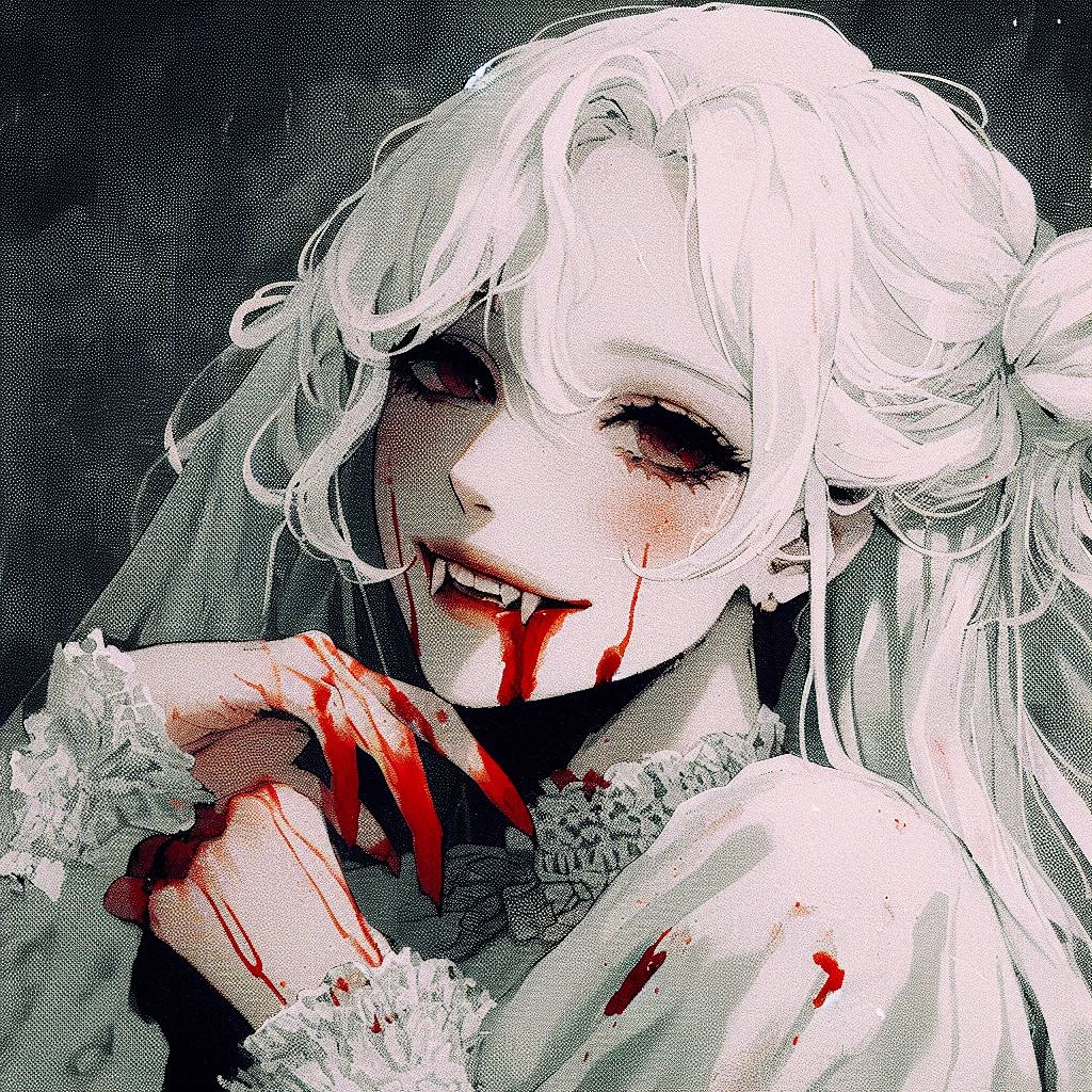 Vampire girl with white hair, blood on her lips, smiling, wearing a dress form eighteen century, a woman with white hair and blood on her face, an album cover by Hayao Miyazaki, cgsociety, aestheticism, 80's anime aesthetic, anime, darksynth, grain texture