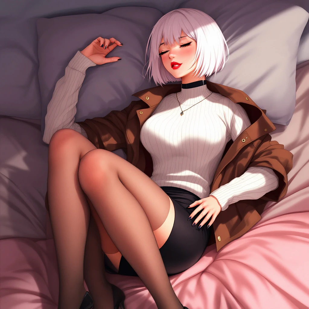 anime, woman, white hair, bob cut, closed eyes, freckles, red lips, white sweater, tight sweater, short leather jacket, brown leather jacket, tight leather jacket, black tight skirt, short skirt, bare legs, black high heels, shy expression, big chest, lying down in bed, stockings