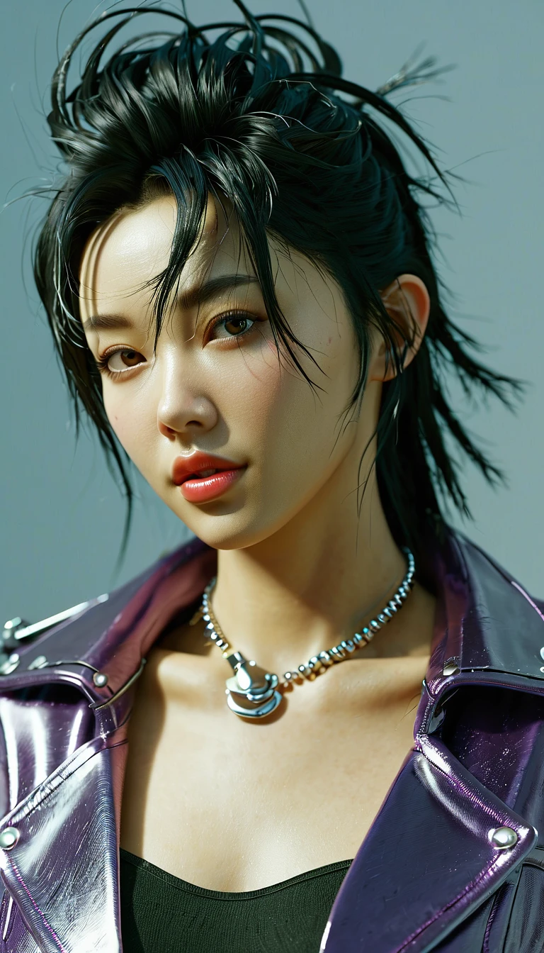 high-resolution image of a Korean girl named Twojuri. She has purple eyes, is framed in a cowboy shot angle (waist-up) , and is standing. These are specific details to ensure accuracy in the visual representation of the character