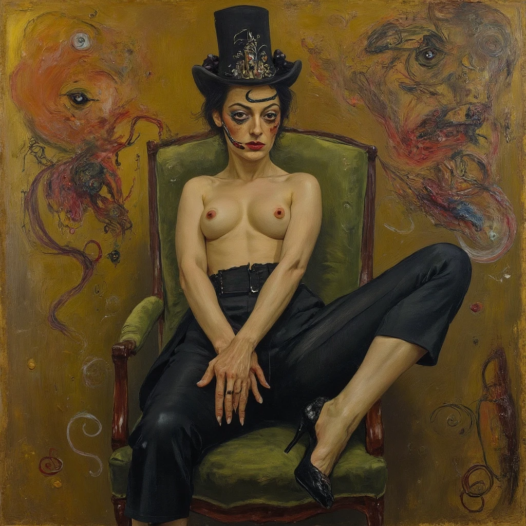 Abstract Full-Body Portrait of a Prostitute – Salvador Dalí (Late-Life Style, Singular Focus & Pure Surrealism) (Surrealism:1.7, Salvador Dalí late-life style:2.0, Dreamlike distortion:1.6, Hyperreal textures:1.5, Chiaroscuro contrast:1.4, Oil-painting brushstrokes:1.5, Organic fluidity:1.6, Metaphysical realism:1.4) A full-body surrealist portrait of a prostitute, painted in the unmistakable late-life style of Salvador Dalí, where dream logic dictates form and reality bends into its own subconscious reflection. She stands alone in the void, a lone figure frozen in motion yet melting into time itself. Her body is elongated but coherent, her limbs refined into one singular, fluid, organic motion, as if she is a sculpture made of half-formed candle wax, melting at the edges but never fully dissolving. Her face remains untouched by distortion, hyperreal and melancholic, eyes darkened with kohl, staring directly outward, unblinking, as if confronting time, fate, and the fabric of reality itself. A single strand of jet-black hair escapes from her carefully pinned curls, swaying in an invisible breeze. Her lips—painted a deep, blood-red—drip slightly at the edges, as if smeared by unseen hands, caught between seduction and sorrow. Her dress, a relic of the past, is a contradiction of luxury and decay, the hem transforming into thin wisps of smoke, curling and dispersing into the canvas. The fabric is stretched unnaturally, its folds elongating like the melted forms of Dalí’s classic clocks, one shoulder slipping in an eternal descent, never quite falling. The setting is an infinite, surreal landscape—a lonely street with no visible end, where shadows stretch longer than their owners, and the cobblestones appear to melt into liquid mercury. In the background, a large, antique pocket watch, twisted and partially submerged in the air, hangs frozen at an uncertain hour, its hands warped into elongated spirals. A single red rose, impossibly large and impossibly alive, hovers just behind her, its petals peeling away like fragments of forgotten love letters. The air feels thick, painted with visible brushstrokes, where light and shadow do not obey the laws of physics—instead, they bleed into one another, wrapping around her body in soft, liquid chiaroscuro, mimicking the curvature of a dream. She is not merely a woman but a symbol—of desire, of loss, of something slipping through time like sand through Dalí’s own fingers.