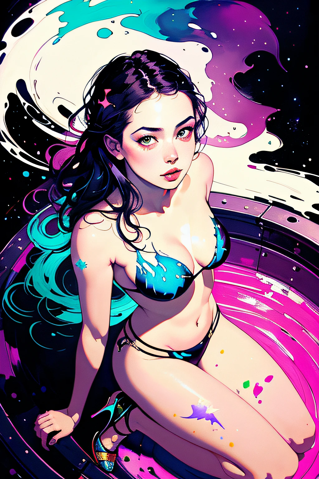 a beautiful ravishing naked woman completely covered in paint floating in a pool, beautiful lighting, upclose, large beautiful detailed eyes, nirvana, relaxed, chill, from above, full body, paint drops, paint swirls, paint splatter, high heels, (beautiful spiral paint swirls) , by jeremy mann, by sandra chevrier, by dave mckean and richard avedon and maciej kuciara, high detailed, 8k, vivid contrasting colors, chromatic aberration, the stars touch the sky with background of aurora nebula paint stars , vivid bright colors, a vibrant digital illustration, black background, behance hd, Masterpiece, best quality, (realistic:1.2) , (high contrast:1.2)
