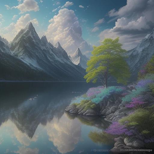 Colorful, Detailed, 4k, Ultra Hd, Realistic, Vivid Colors, Highly Detailed, UHD Drawing, Pen And Ink, Perfect Composition, Beautiful Detailed Intricate Insanely Detailed Octane Render Trending On Artstation, 8k Artistic Photography, Photorealistic Concept Art, Soft Natural Volumetric Cinematic Perfect Light, lake blue crystal, mounteins tiny, clouds bright, tree green. Day.