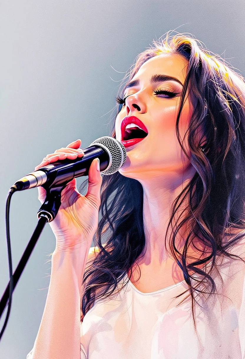 Sketch Art, Beautiful Colored Pencil Line, Artistic Brush Strokes, Beautiful, Woman Holding Microphone Singing, Open Shoulders, Emotional Music in Beautiful Portrait Style, Perfect Composition, Incredible Detail and Beautiful Rendering, Trending on ArtStation, 8k Fine Art Photography, Realistic Conceptual Art, Perfect Light in Natural Volumetric Cinematography, Soft Light and Shadows, Award Winning Photography, Masterpiece, Oil on Canvas, Raphael Caravaggio, Greg Rutkowski, Beeple Beksinski, Giger