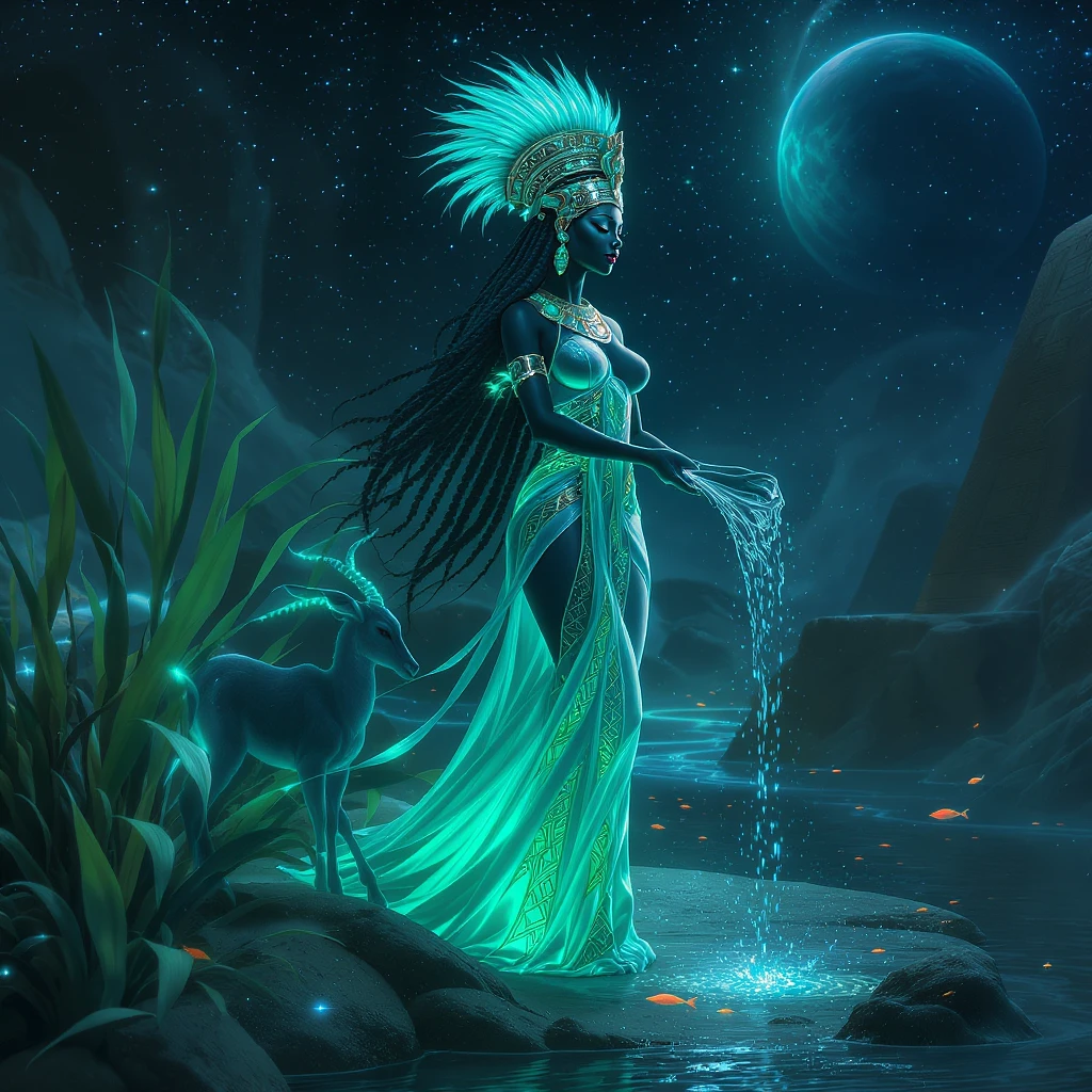 "nft_name": "Anukhet, Goddess of the Nile", "collection": "Divine Neteru: Khemetic Goddesses Reborn", "description": "Anukhet, the Khemetic goddess of the Nile, reimagined in an Afrofuturist aesthetic. This NFT captures her life-giving essence and Nubian grace, blending Khemetic mythology with futuristic digital art. ", "visual_design": { "character": { "pose": "Dynamic pose, as if pouring water", "attire": { "type": "Light robe", "colors": ["aqua blue", "emerald green"] , "details": "Shimmering with water-like reflections and holographic wave patterns" }, "crown": { "type": "Feather headdress", "details": "Tall feathers glowing with neon-aqua accents", "animation": "Gentle swaying feathers" }, "accessories": { "gazelle": { "position": "Beside her", "details": "Holographic gazelle companion with animated movement", "animation": "Subtle gazelle trot" }, "nile": { "position": "From her hands", "details": "Digital Nile waters pouring from her hands", "animation": "Flowing water effect" } }, "eyes": { "description": "Gleaming with river-like clarity, reflecting life", "colors": ["aqua blue", "emerald green"] } }, "background": { "setting": "Futuristic Nile in a cosmic Kemet", "elements": [ "Holographic papyrus reeds", "Digital river with neon fish" ], "animations": [ "Swaying reeds", "Swimming neon fish" ] } }, "afrofuturist_elements": { "description": "Fuses Khemetic vitality with sci-fi fluidity", "details": [ "Holographic wave patterns on robe", "Digital Nile with neon fish and reeds", "Glowing feather headdress and animated gazelle" ], "inspiration": "Aya’s AI-driven Generating Binti Worlds" }, "color_palette": [ "aqua blue", "emerald green", "neon aqua", "cosmic silver" ], "art_style": { "primary": "Hand-drawn detail for Khemetic authenticity", "secondary": "AI-enhanced effects for futuristic dynamism", "description": "Combines Khemetic river imagery with Afrofuturist sci-fi aesthetics, featuring subtle animations for digital vibrancy" }, "technical_specs": { "platform": "XRP Ledger (XLS-20 standard) ", "file_format": "PNG or MP4 (for animations) ", "resolution": "2048x2048 pixels", "storage": "IPFS for decentralized hosting, cached on Cloudflare for fast display", "metadata": { "attributes": [ { "trait_type": "Goddess", "value": "Anukhet" }, { "trait_type": "Rarity", "value": "Rare (1 of 40) " }, { "trait_type": "Headdress", "value": "Feather headdress with neon accents" }, { "trait_type": "Animation", "value": "Flowing Nile and trotting gazelle" } ], "royalty": "10% transfer fee", "flags": ["tfBurnable", "tfTransferable"] } }, "prompt_summary": "Create a digital NFT artwork of Anukhet, the Khemetic goddess of the Nile, in a dynamic pose pouring digital Nile waters from her hands. Her aqua blue and emerald green robe shimmers with holographic wave patterns, and her feather headdress glows with neon-aqua accents. A holographic gazelle companion trots beside her. Her eyes gleam with river-like clarity. The background features a futuristic Nile with holographic papyrus reeds and neon fish. Use a color palette of aqua blue, emerald green, neon aqua, and cosmic silver, blending hand-drawn Khemetic details with AI-enhanced sci-fi effects. " }