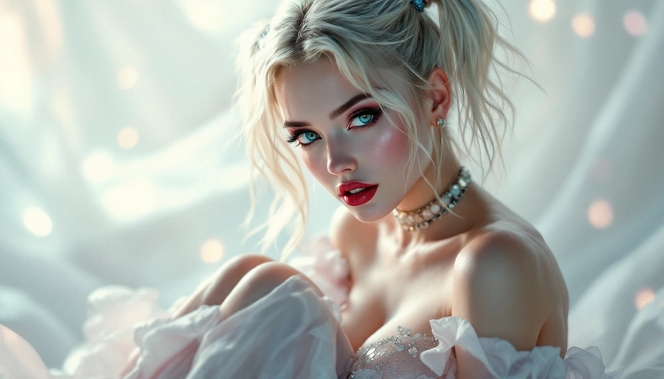 A stunning masterpiece showing a Harley Quinn portrayal in a dreamlike and captivating light. She wears a delicate and detailed mini-skirt outfit with flowing fabrics, set against a background with a soft and subtle gradient that accentuates her form. Her detailed photorealistic face is enhanced with soft makeup, with a manga-inspired style and perfect eyes that seem to glow with an inner light. The UHD picture has a gentle crystal translucency, showcasing her ethereal beauty and dreamlike presence. With a graceful and seductive pose, Harley’s allure draws you into her whimsical and otherworldly world.