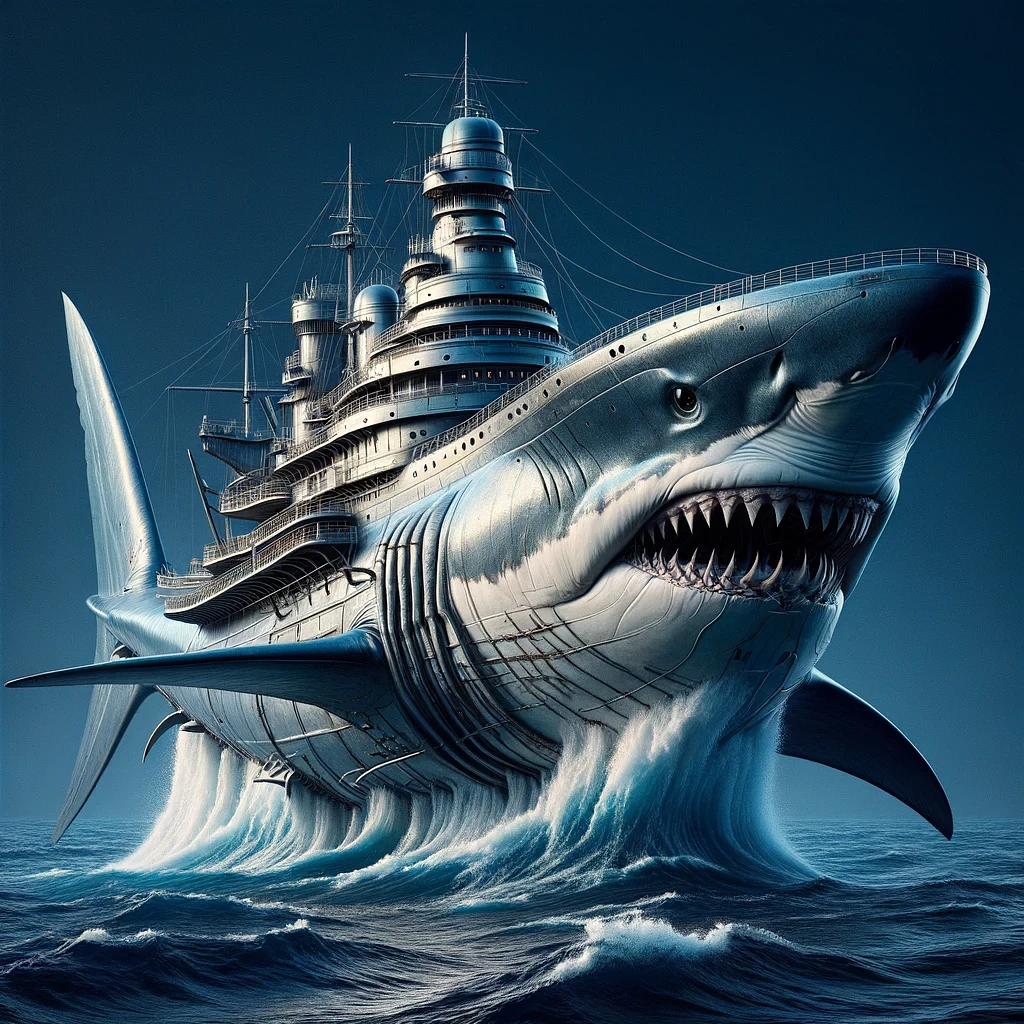 Ultra-detailed 8K Photography: A hyper-realistic representation of a massive shark conceptualized as a state-of-the-art ship. The shark's powerful and streamlined body serves as the hull of the vessel, while the dorsal fin acts as a majestic sail. The deep blue ocean surrounds the shark-ship, with waves crashing against its sides, emphasizing its grand scale. Every detail, from the rough texture of the shark's skin to the polished deck and railings on its back, is captured with impeccable clarity, creating a unique fusion of marine life and maritime engineering.