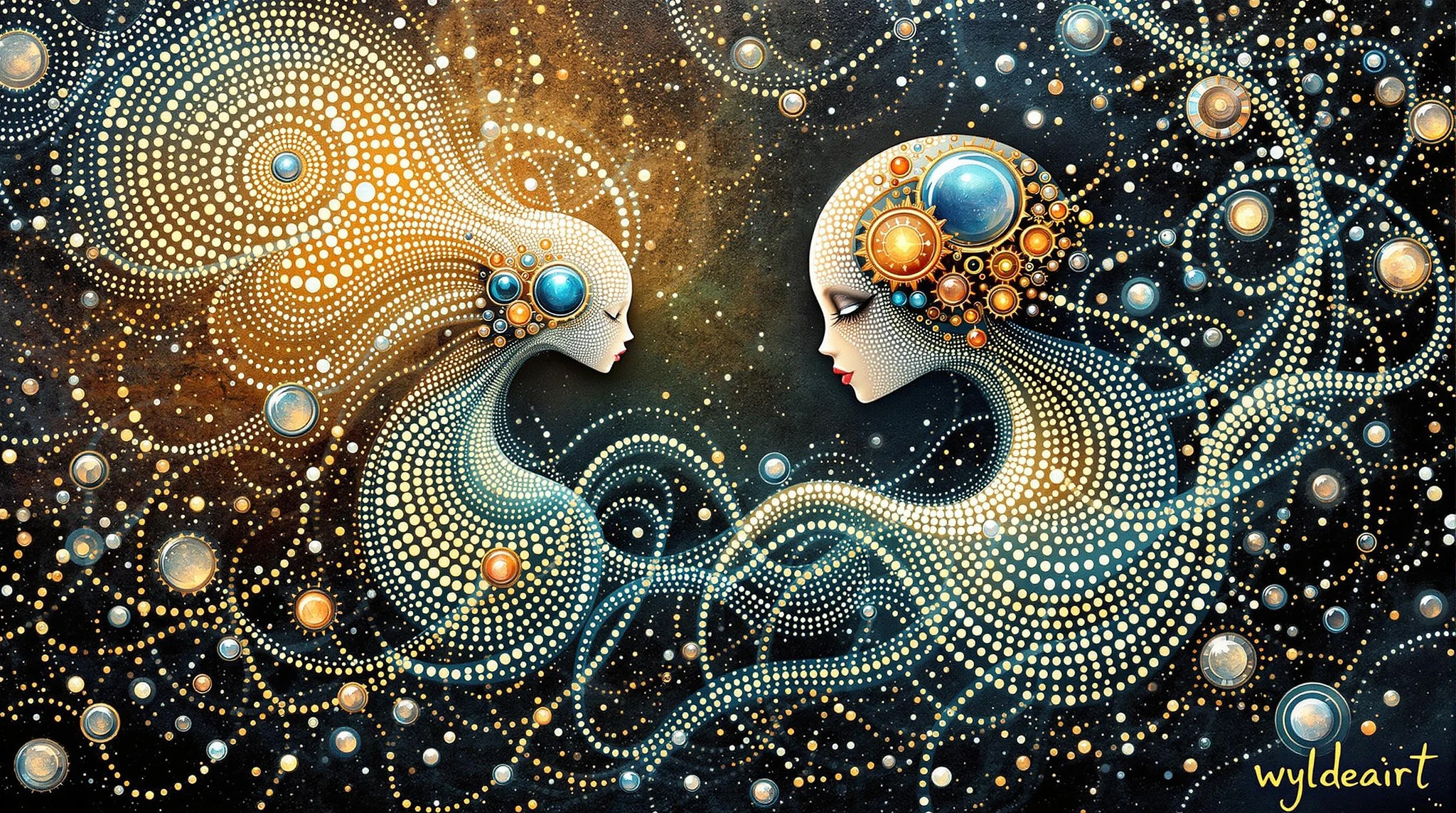 Steampunk bio-morphic ethereal glow. Acrylic splash art, opaline pearlescent ink, translucent glaze. Anthropomorphic Steampunk biomorphic Australian Dreamtime Faeries, newborn life creation, . Dot art, hyper textured, spiral fractals concentric circles. 'wyldeairt' is written in small discrete faint cursive script bottom right corner.