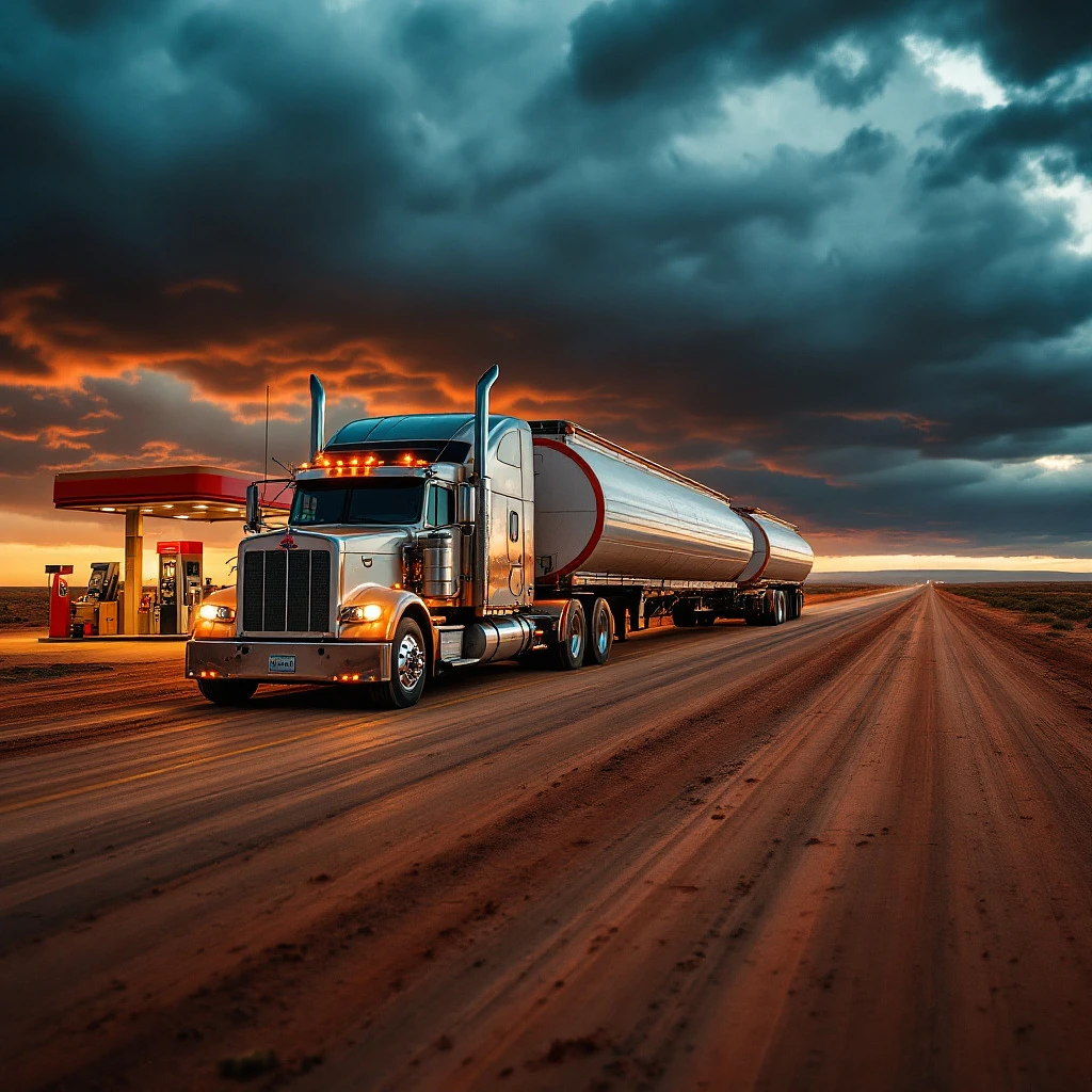 An Australian truck with two trailers at a gas station in the Outback on a dusty road. Impressive long vehicle, storm clouds, wide-angle view, low horizon. NatGeo photography