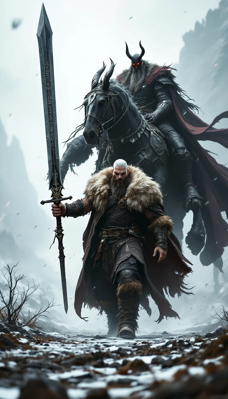 An ultra-realistic, zoomed out, front facing full-body portrait of a towering Berserker, his fur-lined cloak billowing in the wind. He is holding a big greatsword in his hand inscribed with Nordic runes pulses with power as he is walking forward toward the camera, his piercing eyes fixed in front. Behind the berserker, is Odin in his full black armor, horned helmet, and glowing red eyes, who sits on top of his six-legged horse side posing looking towards the camera, his tattered cape trailing behind him like a storm. Snow swirls in the air across a desolate battlefield. Character design with a final boss concept vibe. The image combines advanced digital artistry techniques, including V-ray tracing and ZBrush sculpting, Unreal Engine 5 rendering, and Substance Painter detailing with mixed-media digital painting. Every element is brought to life in UHD resolution. detail, photorealistic, realistic light, wide angle, kinkfolk photography, A+D architecture