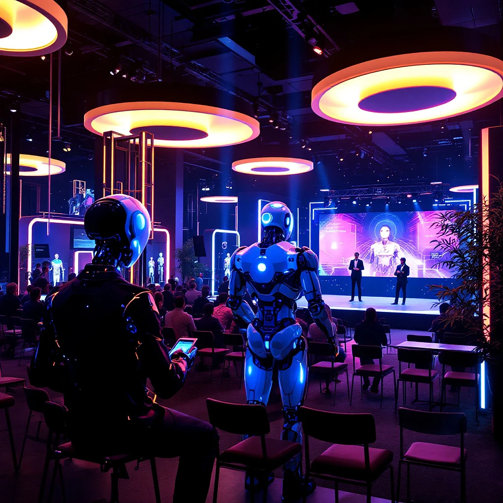 A futuristic AI conference in Silicon Valley, filled with neon-lit booths showcasing humanoid robots, with a keynote speaker presenting in front of a massive LED screen. "