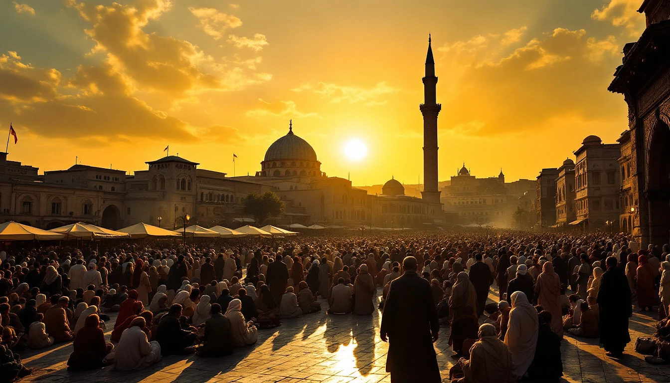 a wide-angle photograph of a bustling medieval marketplace at sunset, with a large crowd of people gathered in the foreground. The crowd is diverse, with people of all ages and genders, dressed in a variety of attire, including traditional clothing and dress. Some people are sitting on the ground, while others are standing or walking. In the background, there are several buildings, including a large mosque with a tall minaret and a dome-shaped roof. The sky is a deep orange and yellow, with clouds scattered throughout. The lighting is warm and golden, with long shadows cast across the ground. The camera used is likely a wide-angle lens, which captures the expansive scene and emphasizes the depth and distance of the image.