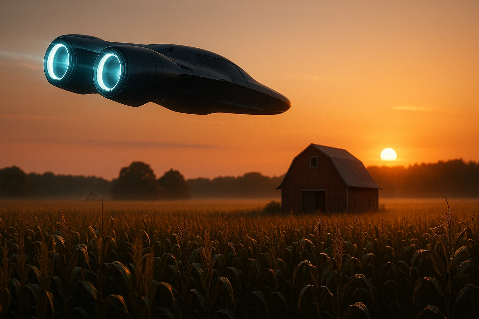 A sleek, futuristic black spaceship with glowing blue engine rings flies low over a golden cornfield at sunset, casting long shadows over the crops. A rustic red barn stands quietly below, surrounded by lush corn swaying in the warm breeze. The horizon glows with a soft orange gradient as the sun dips behind a distant forest, creating a peaceful yet surreal contrast between advanced technology and rural earth. Cinematic lighting, anamorphic lens flares, ultra-realistic textures, soft atmospheric haze, 4K detail, shallow depth of field, high dynamic range.