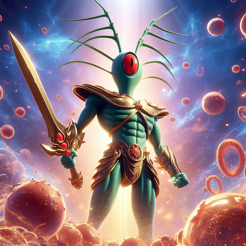 plancton is the mightiest god with a sword, red eyes, heroic pose, divine and celestial light, masterpiece, octane render, 8k, raytracing