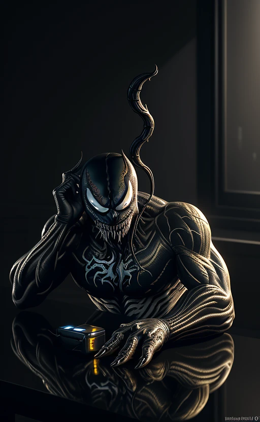earphone on the table with the design and character of Venom The earphone is gold and Black dark, no watermark, no copyright, high gloss, highly detailed, intricate, silver scrollwork, unreal engine 5, octane render, lumen reflections, quixel megascan, 8k, studio lighting, —ar 1080:1920