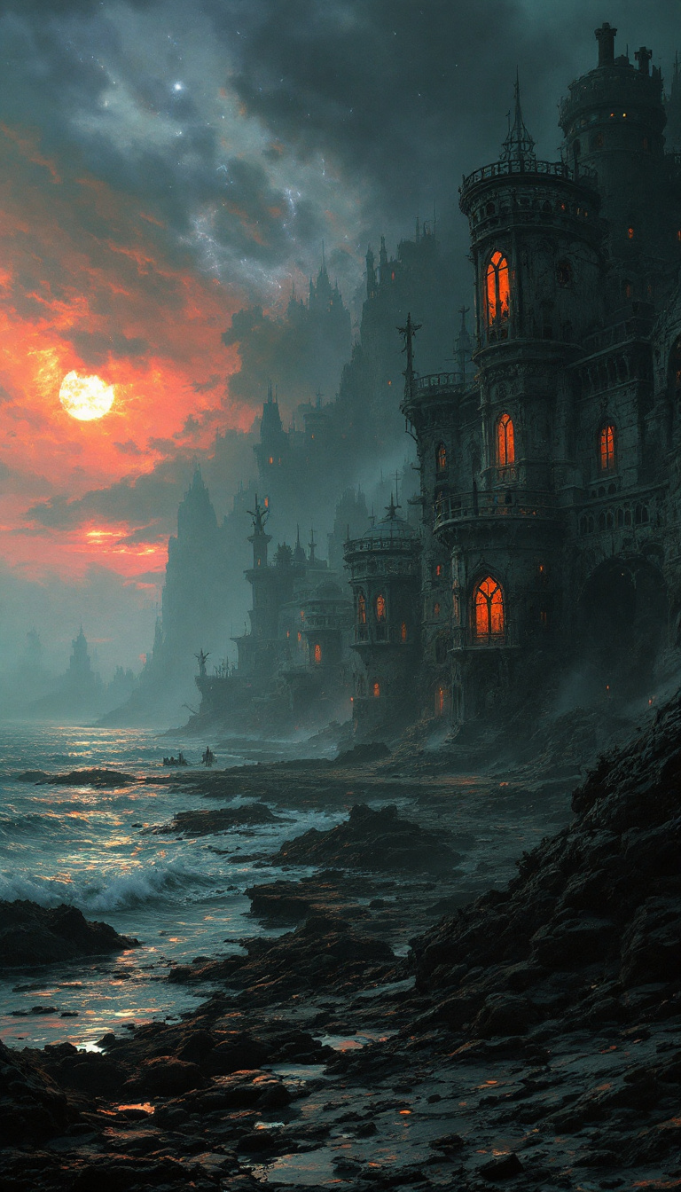 FLUX prompt: Necromancy,Coastal Town,Decaying Architecture,Eldr...
