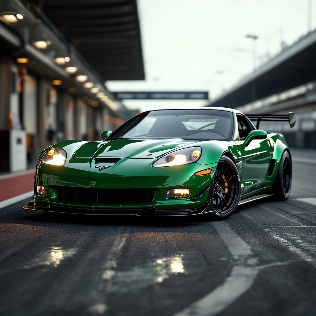 General outline of a latest model British racing green 2000 corvette, with glowing headlights, polished to a high shine, parked on a race track in germany, bright atmosphere, artgerm, hygge,