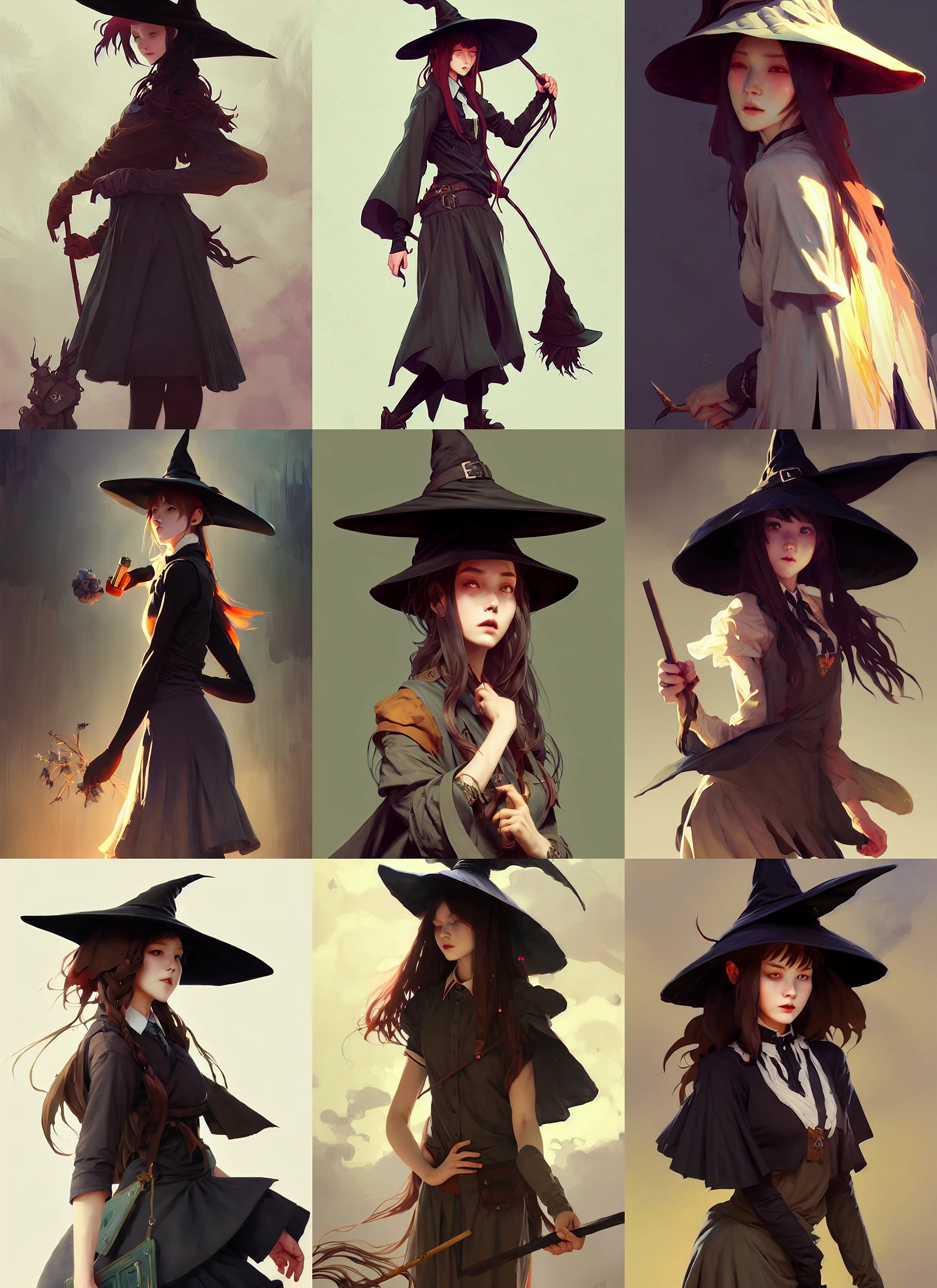 rugged girl witch wearing magic school uniform, large wide - brimmed witch hat, cinematic, elaborate, elegant, masterpiece, illustration, digital painting, concept art, trending on artstation, pixiv, art by ruan jia and hong soonsang and wlop and artgerm and greg rutkowski and alphonse mucha