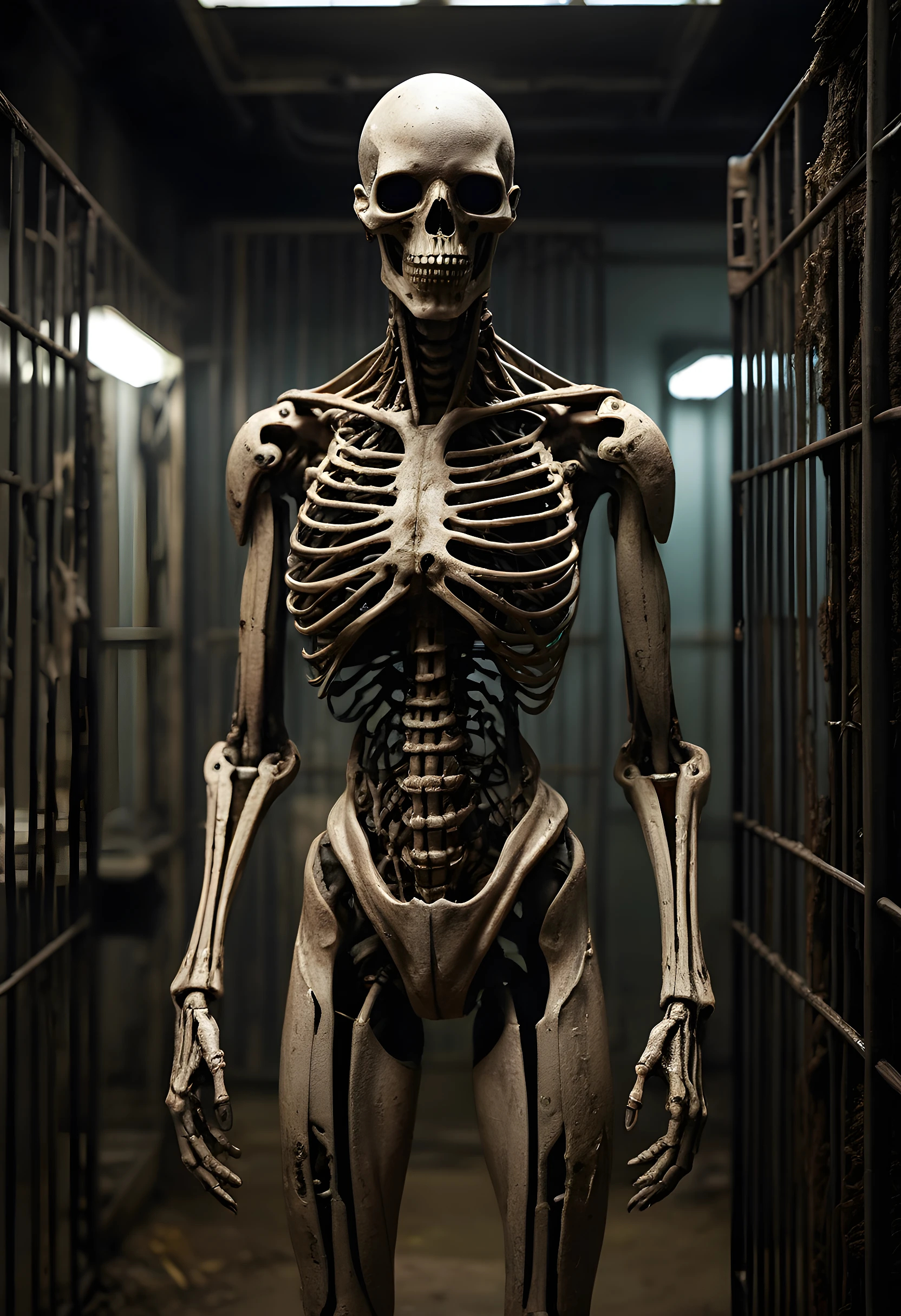 Ribcage visible, matted fur and dirt crusted on thinning skin, skeletal yet muscle still clinging to bone, emaciated canine locked in a metallic cage, eyes wild with madness and pain, within a dimly lit underground laboratory resembling something out of a BBC dystopia series, detailed circuitry and machinery for inhumane experimentation visible in the background, captured on a security feed for a shadowy corporation pushing the boundaries of bio-engineering, style reminiscent of concept art for films like Blade Runner or The Hunger Games with its grimy cyberpunk aesthetic.