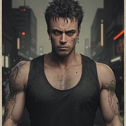 Portrait/ man in a tank top, high temperature man has a Black eye, and stitches which shows his gritty tough rebel attitude, cyberpunk-Fight Club inspired, poster style, He ponders to Delusional ineptitude wrapped in codependency, Constant comparative, running low on dopamine dumpster, walking around the city, avoiding anything tangible, exhaling out in anger, he flicks his cigarette while flicking off a cop (Middle-finger) in the distance, cinematic lighting, battered, low angle, trending on artstation, 4k, hyper-realistic, focused, extreme details, unreal engine 5, cinematic, masterpiece
