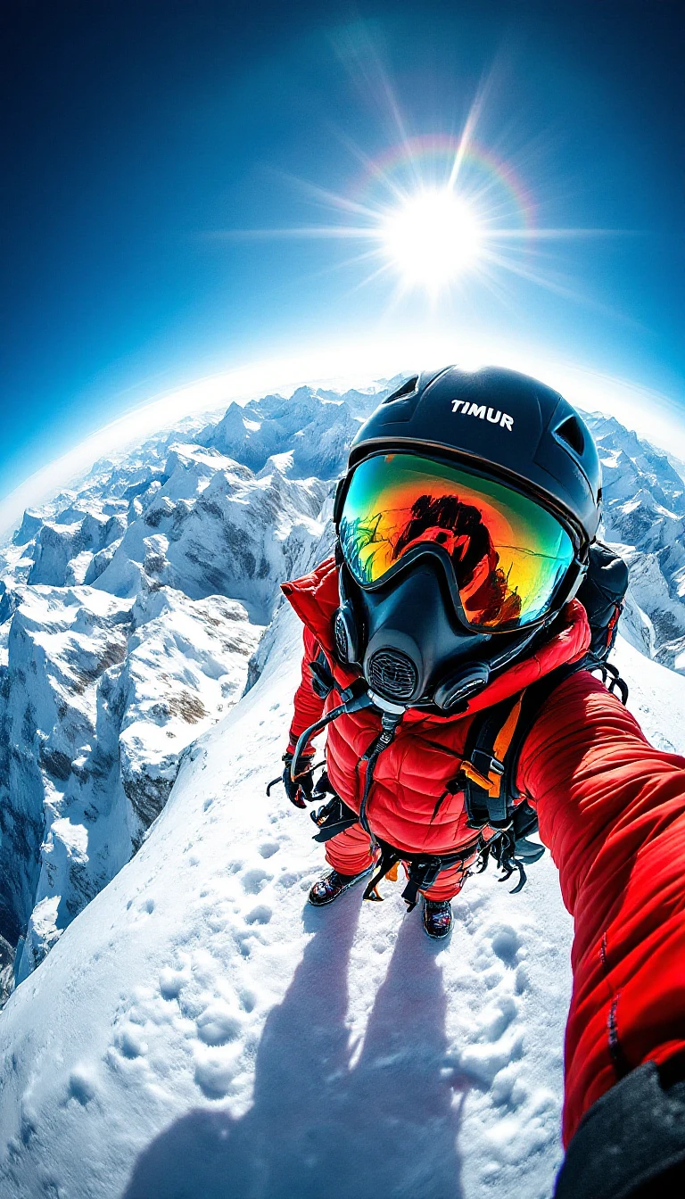 This is a handheld selfie photograph that captures a lone climber facing the camera slightly turned to show the scenery with his arm while climbing Mount Everest, taken from a low angle with a fisheye lens, providing a wide and distorted perspective of the surrounding landscape. This is a close-up from above of the climber wearing a bright red down suit, a heavy backpack with attached equipment, and modern mountaineering boots. He shows the landscape, all lightly covered in snow and frosted by the cold of the altitude. The climber's face is protected by large, snow goggles with colorful polarized mirror and an oxygen mask, essential for high-altitude climbing, on the front of his black helmet is written "TIMUR". In the reflection of the mask, one can see the landscape of snow-capped peaks. The background reveals a breathtaking panorama of snow-covered peaks and ridges under a clear blue sky, with a faint, circular rainbow-like halo visible around the sun due to the lens effect. The image conveys the challenging yet awe-inspiring environment of climbing the world's highest peak.