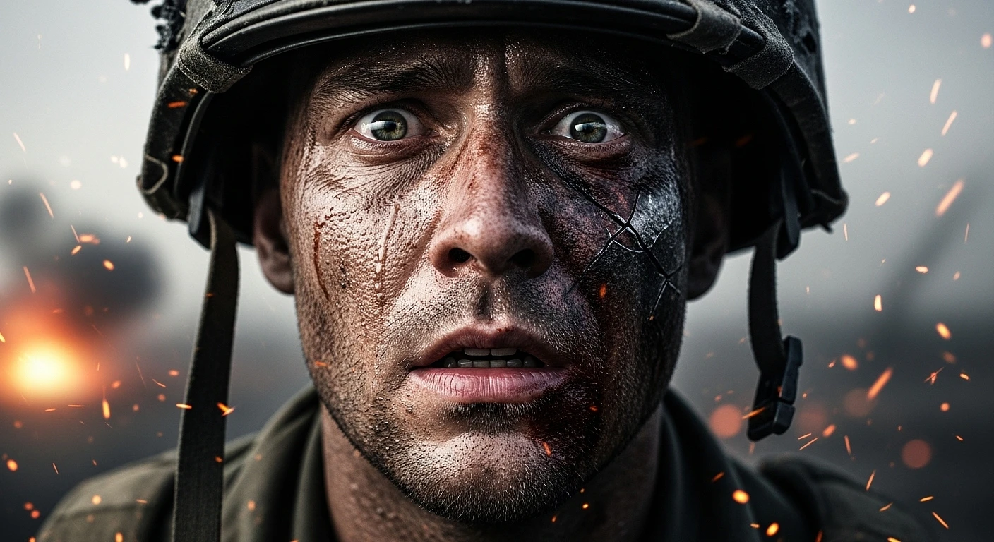 A close-up of a battle-worn soldier who just survived a violent explosion. His face is covered in ash, dried blood, and sweat. His expression shows a raw mix of terror, shock, and disbelief — wide haunted eyes, trembling lips, and tense jaw. One side of his helmet is cracked and blackened. Small embers and smoke float behind him in a scorched, blurry battlefield. The lighting is harsh and moody, casting sharp shadows across his dirt-covered face. Ultra-realistic textures, cinematic depth of field, 85mm lens, f/1. 4. Emotional intensity, gritty atmosphere, horror-infused realism.