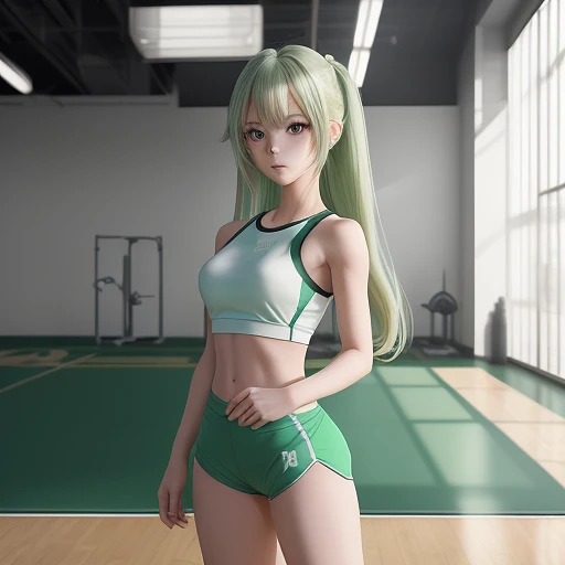 an anime girl is standing in a gym, in the style of photo-realistic techniques, light emerald and light bronze, sharp edges, barbiecore, gorgeous colors --ar 12:19 --s 750 --niji 5