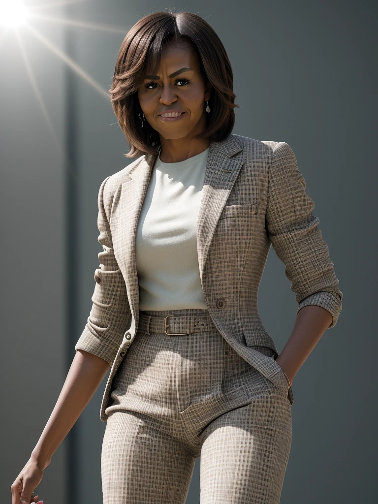 portrait of Michelle Obama dressing masculine clothes, ultra realistic, 8k full HD, low angle, unreal engine 5, cinematic, masterpiece, insane detail, real photography, bright colors, sun-soaked colours, Fujifilm X-T4, Sony FE 85mm --ar 900:1600 --s 750 --style raw --v 5. 2 --no naked