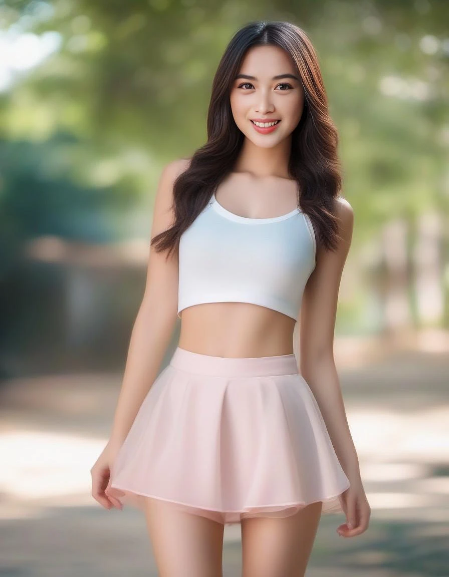realistic, portrait, 1girl, crop top, blonde hair, dark eyes, glowing eyes, skirt, parted lips, blush, sunlight, grin, short shorts, hand on back, half body, humpbacked, . , (transparent skirt:1.2)