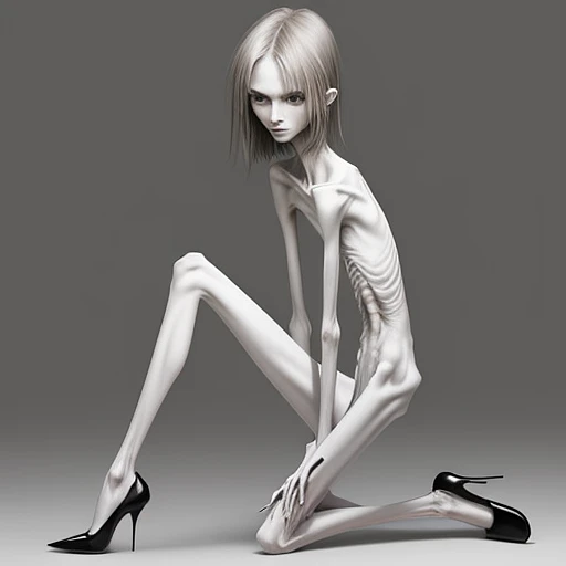 kneering position of extreme skinny slender anorexic girl very skinny slender girl, with long curved claws, skinny legs and long skinny calves in high heels ,