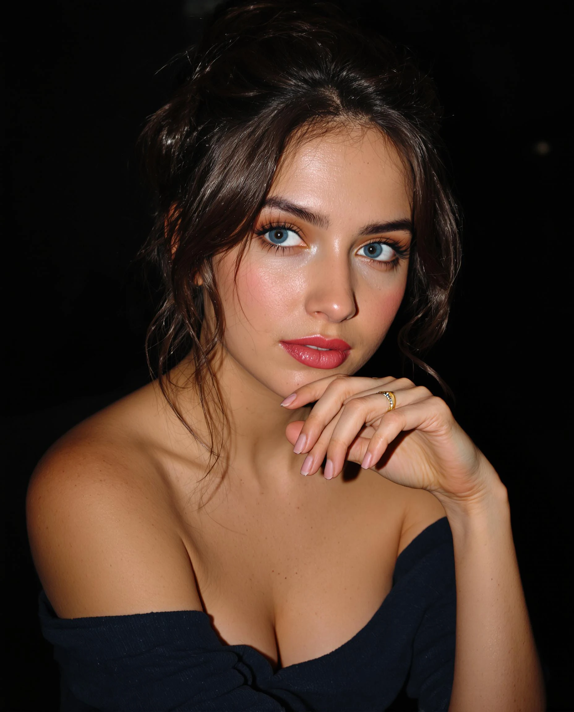 "A highly detailed, ultra-realistic portrait of a 22-year-old young Brunette woman with deep blue eyes. Her soft wavy dark brown hair is styled in a loose updo, with a few strands gently framing her face. She is wearing an off-the-shoulder dark blue top, sitting at a table, leaning forward slightly with one hand delicately touching her chin. Her expression is soft and contemplative, exuding a confident yet mysterious charm. The background is dark and blurred, creating a cinematic depth that enhances her striking features. The lighting is moody and warm, casting soft shadows that highlight her cheekbones and full lips. High-definition textures, natural skin tones, and hyper-realistic details ensure a stunning and captivating look. "