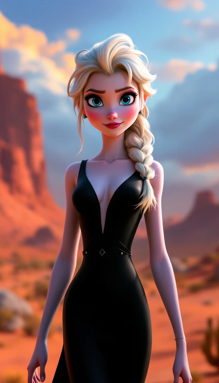 A Disney-Pixar-style animated character of Elsa standing confidently in a sleek black dress; set in an animated desert background with dramatic rolling clouds and golden lighting; her expression exudes strength and determination; slightly exaggerated proportions to match the Disney-Pixar aesthetic; UHD --ar 9:16 --v 6. 1