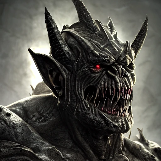 Goldorg, demonic orc from Moria, new leader of the Gundabad, strong muscular body, ugly figure, dirty grey skin, burned wrinkled face, body interlaced with frightening armor, metal coatings crossing head, heavy muscular figure, cinematic shot, detailed, trending on Artstation, dark blueish environment, demonic backlight, unreal engine, 8k, photorealistic, ultra realistic --beta --upbeta --upbeta