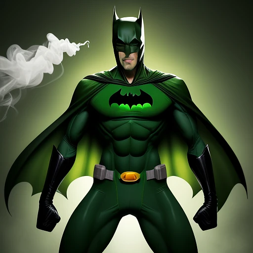 we are seeing a lanky tall guy, in light green superhero tights suit, with green gloves and boots and green under wear and green cape, with a green batman mask with floppy ears, with a weed logo on his chest, smoking a long joint flexing his muscle like a body builder towards camera.