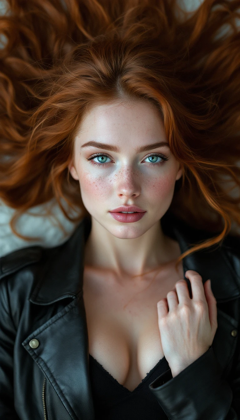 A striking portrait of a woman lying on a flat surface, her fair, freckled skin radiating a soft, natural glow reminiscent of Irish heritage. Her deep, teal eyes gaze softly at the viewer, holding a blend of quiet melancholy and subtle strength. Long, wavy strands of her rich, auburn hair fan out around her head, cascading in all directions like waves of the sea, creating a dynamic frame that enhances the composition. The hair catches the light, revealing subtle golden highlights that add depth and texture. She wears a black leather jacket over a white shirt and dark top, the contrast emphasizing her porcelain complexion. One hand gently rests against her hair, fingers splayed in an elegant gesture, while the other hand lies closer to her face, adding a touch of intimacy to the pose. The overall atmosphere of the image is one of quiet power and ethereal beauty, capturing a moment suspended in time where the subject’s soft, slightly sorrowful expression and the movement of her hair evoke the essence of a stormy yet serene sea. Her palm is facing up.