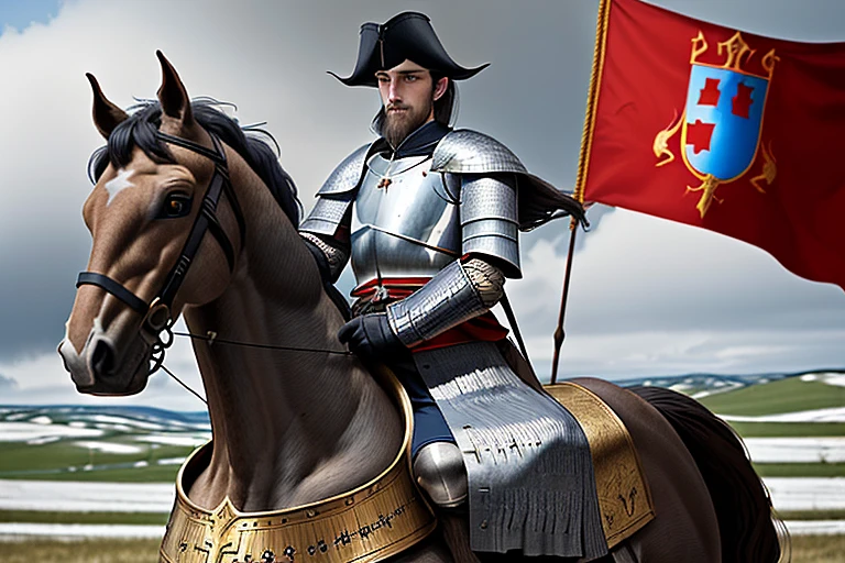 Photo of a ultra realistic knight 1402 year on horse. Illustrate Stefan Lazarevich, the Serbian despot, during the Battle of Angora in 1402, mounted on a powerful war horse amidst the vast expanse of the battlefield. Use existing historical portraits as a reference for Stefan's facial features. His attire should showcase the traditional Balkan war gear from the early 15th century: chainmail, a steel breastplate, a face-exposing helmet, helmet that reveals the face. The shape of the helmet should be pointed upward, with a plume of feathers at the top, and the ears should be covered with chainmail protection. and a colored cloak or tabard adorned with the Serbian coat of arms. The entire scene should be dynamic, with Stefan's right hand confidently pointing forward, signaling a charge against the enemy. In the background, capture the grandeur and chaos of the battle, emphasizing the immense significance of this confrontation in resisting Turkish expansion into the Balkans.