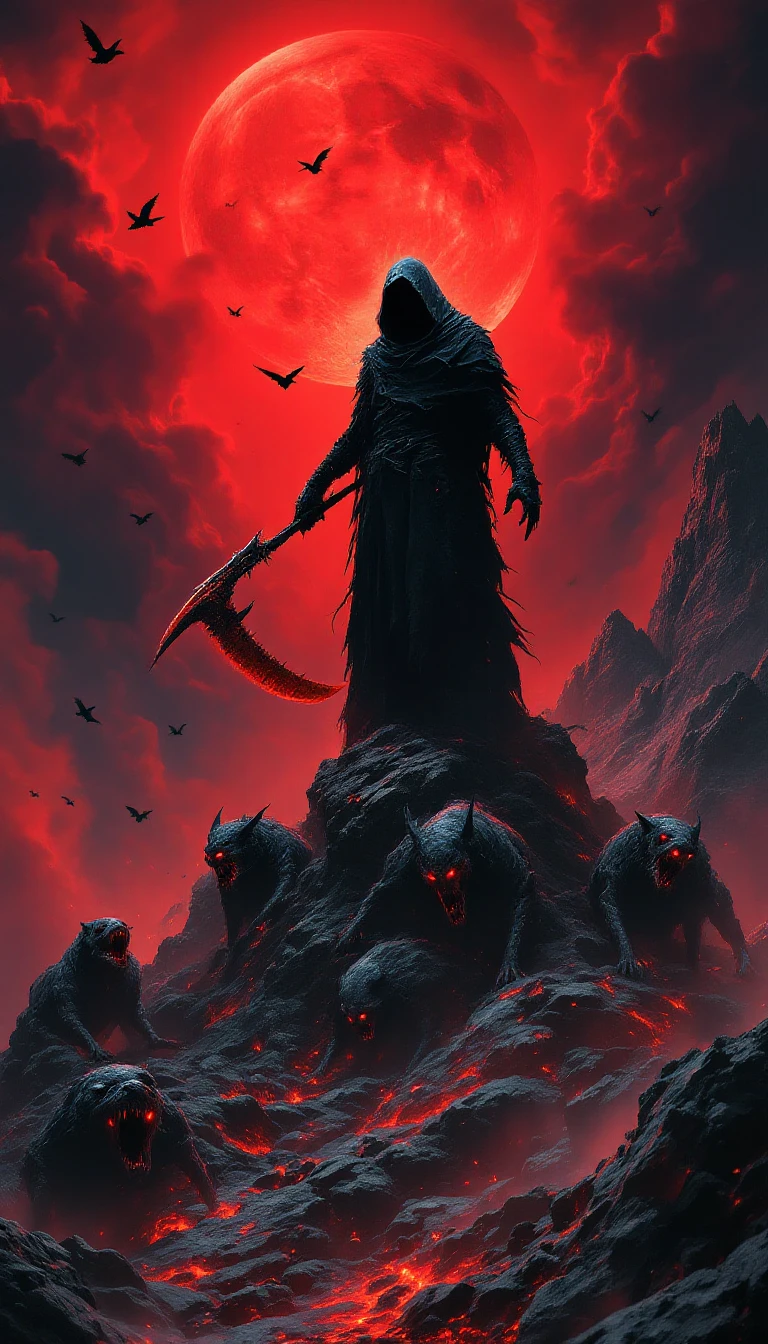 A dark, cloaked figure of death stands tall and imposing atop a jagged, infernal mountain range under a blood-red sky. The figure is faceless, shrouded in black tattered robes, and wields a massive, worn scythe with a jagged, rusted blade. Surrounding the figure are hellhounds with glowing red eyes and snarling expressions, emerging from the rocky, skull-littered terrain.