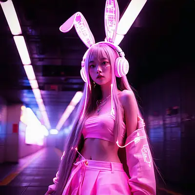 The pink bunny girl in the cyber world is a cyberpunk (full body photo) , with beautiful long hair, wearing a pink skirt, pink bunny ears, pink headphones, neon lights, and a sense of technological future. Phase One XT IQ4 150MP, low exposure, high contrast, ISO 50, with an 80mm prime lens.