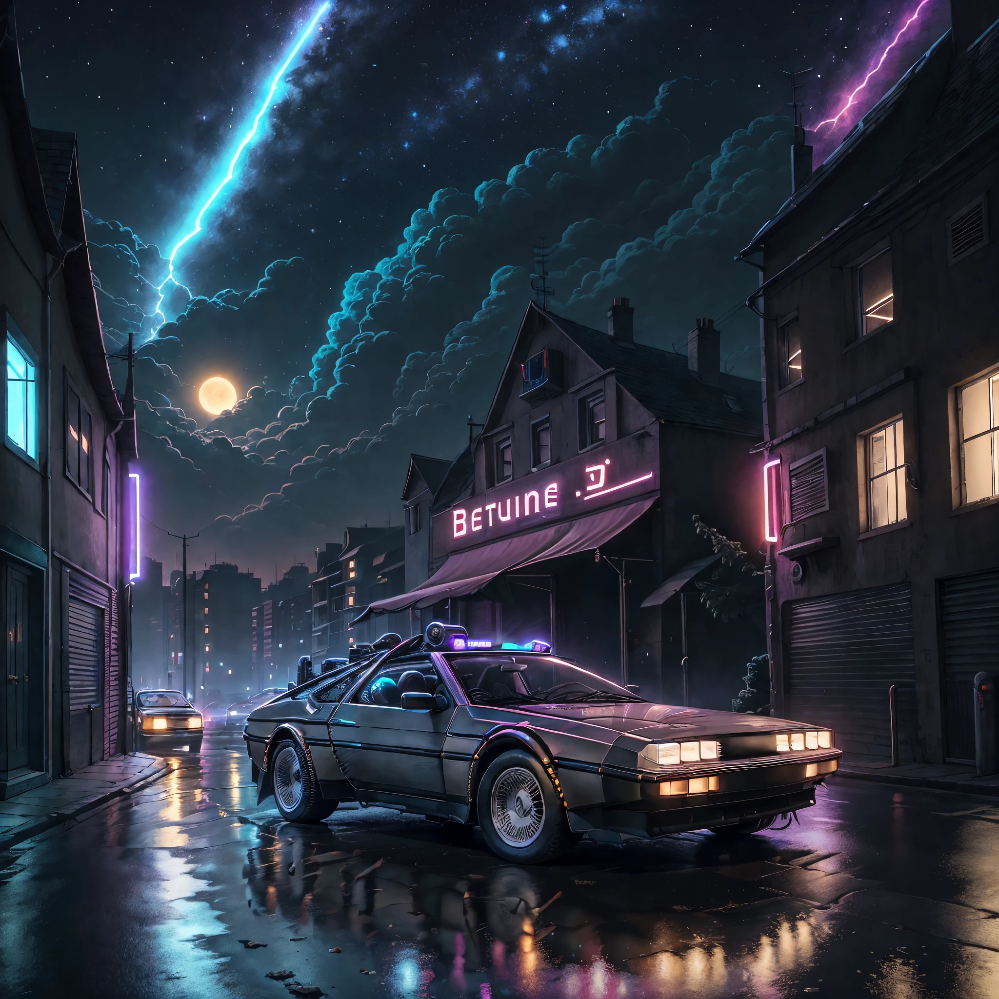 Retro wave. city, delorean dmc-12 , wide kit, road, purple neon lights, sun, mountain, (masterpiece, detailed, high-res) , different angles, movie, back to the future
