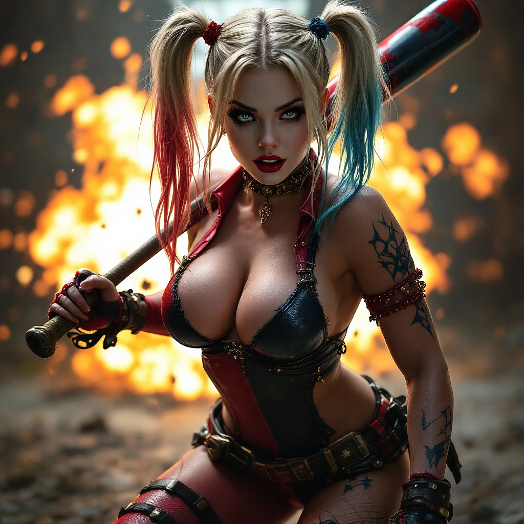 Milf dressed as harley quin, revealing cleavage, baseball bat she looks suprised, cute mom, Bending over on her baseball bat, explosion behind her, full body view