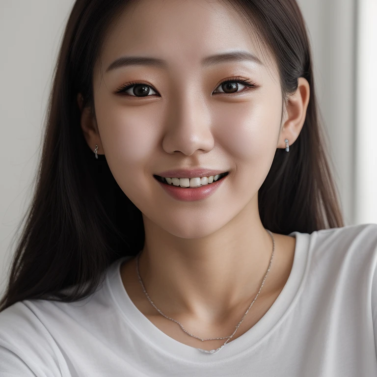 hyper realistic headshot photo of a 25 year old corean woman, white t-shirt, extreme slim, extreme skinny, expensive jewelry, looking into the camera, smiling slightly, ultrarealistic, soft lighting, 8k
