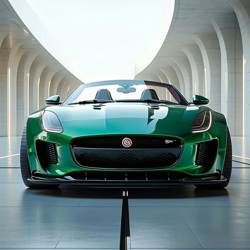 Create a highly detailed and vibrant 16:9 aspect ratio image of a futuristic Jaguar F-Type convertible. The car should have a wide body design, jet engines on each side, and be in British racing green color. It should be depicted as sleek, aerodynamic, and set against a realistic luxurious and glamorous background. The image should be highly detailed and vibrant, incorporating the specified features and colors to create a visually striking and futuristic scene. Please ensure that the image has a stylized effect with a value of 750.