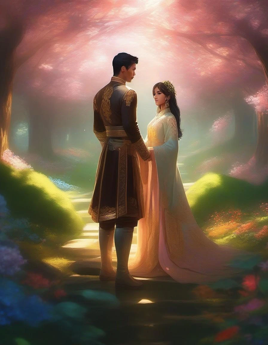 couple, bush, day, fantasy, flower, forest, grass, green theme, leaf, light rays, moss, nature, no humans, outdoors, scenery, sunbeam, sunlight, tree, thick acrylic illustration, gorgeous anime, oil painting, extreme iridescent reflection, flower decorations, chiaroscuro, holy cinematic rim lighting, rococo art