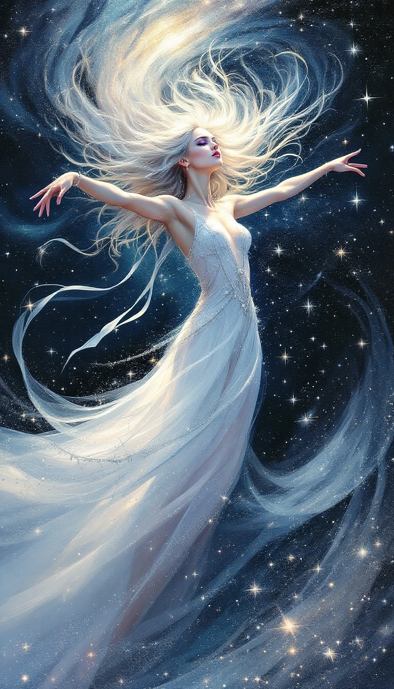 "Platinum Dancer in a Cosmic Whirlwind": A mesmerizing abstract painting showcases a dancer, exuding both grace and an otherworldly presence. She is a skilled performer, shown amidst a swirling vortex of stardust and light, with fair skin, long, platinum-blonde hair that seems to flow with the currents of space, and a simple, flowing gown with celestial accents. Luminous veils, ribbons, and star-like jewels are attached to her wrists and hands. The artwork skillfully blends modern abstract techniques with a figure study, creating a breathtaking and ethereal scene with tones of whites, silvers, and blues. Her serene, violet eyes, the composition’s focal point, convey both a sense of inner peace and a deep connection to the cosmos. After a night spent dancing among the stars, the dancer embodies both beauty and an otherworldly grace. The soft lighting and dynamic movement invite the viewer to uncover the hidden narratives within this vibrant artwork designed as a painting.