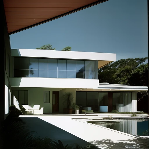 Hyper realistic eye level exterior photo of a mid century modern style house overlooking the ocean, daylight, indirect lighting, AD magazine, Frank Lloyd, Eames, Mies van der Rohe