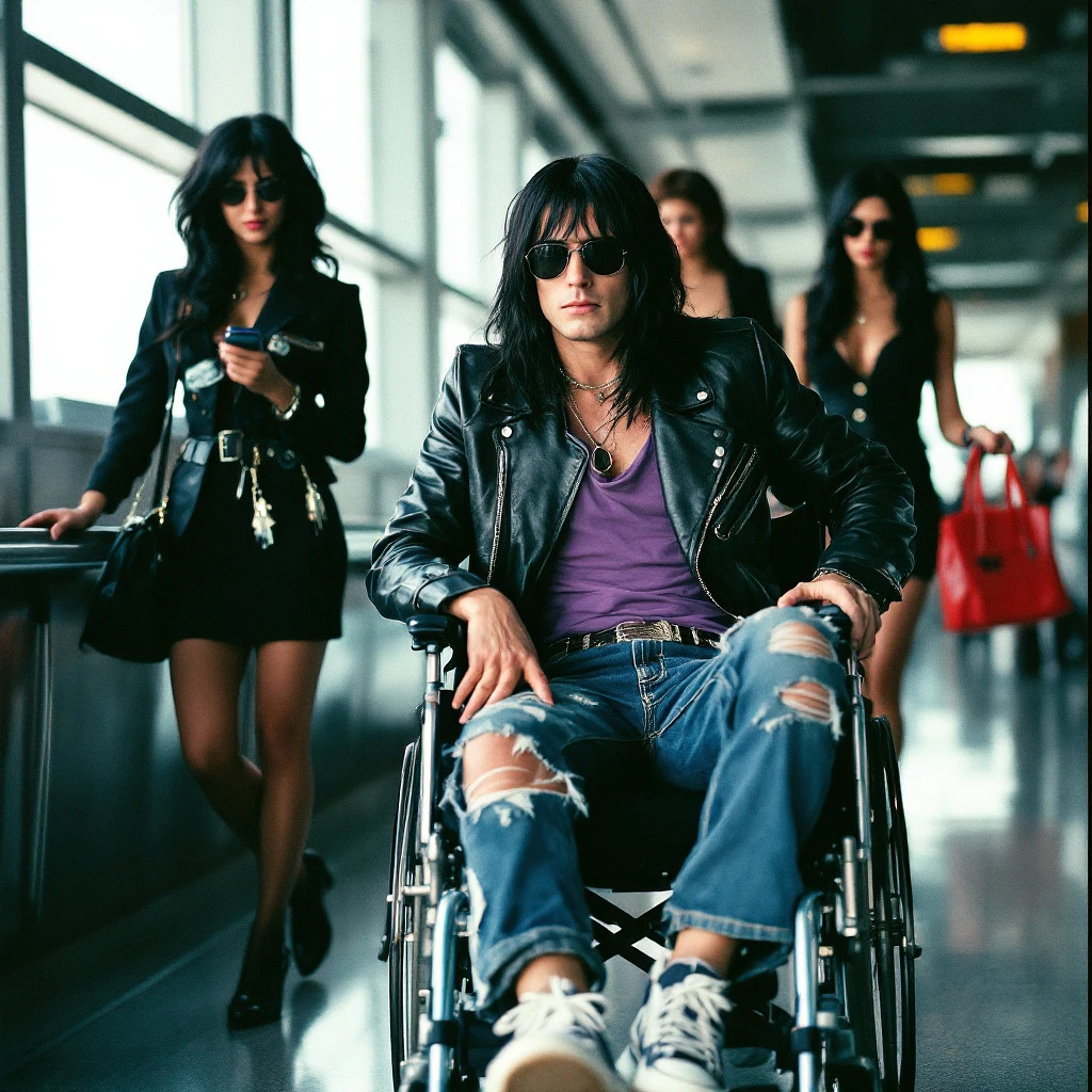 joey Ramone, with his long black hair and bangs , in his leather jacket and purple t-shirt , rayban sunglasses , distressed blue jeans and converse white shoes being pushed in a wheelchair at airport by sexy stewardesses