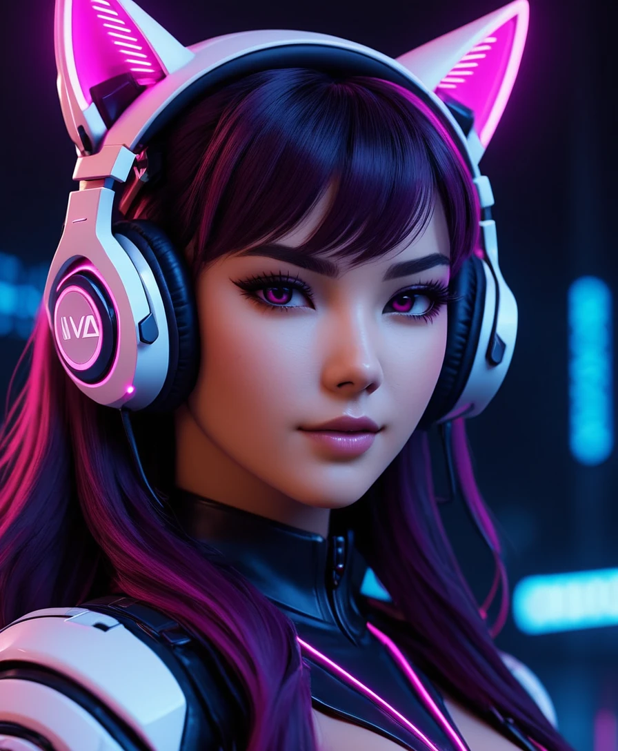 Neonpunk style Masterpiece, Best Quality, High Resolution, 1Girl, Ultra High Resolution, Solo, Mecha Pilot, D. VA, Headphones, Pink Eyes, Cat Face Adornament, Blue Tights, Brown Hair, White Gloves. cyberpunk, vaporwave, neon, vibes, vibrant, stunningly beautiful, crisp, detailed, sleek, ultramodern, magenta highlights, dark purple shadows, high contrast, cinematic, ultra detailed, intricate, professional
